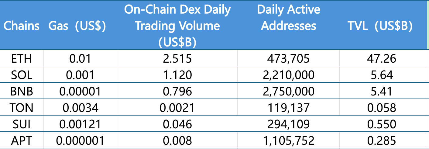 Phân tích dữ liệu hiện tại của các Layer1 chính bao gồm ETH, SOL, BNB, TON, SUI và APTOS dựa trên khối lượng giao dịch hàng ngày, địa chỉ hoạt động hàng ngày và phí giao dịch.