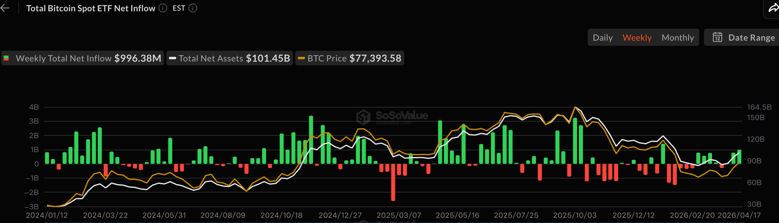 - Thị trường tổng thể đi lên: Tổng vốn hóa tiền điện tử toàn cầu tăng 5,22% lên 2,62 nghìn tỷ USD, ETF spot Bitcoin và Ethereum tuần này lần lượt có dòng tiền ròng vào 996 triệu USD và 187 triệu USD.