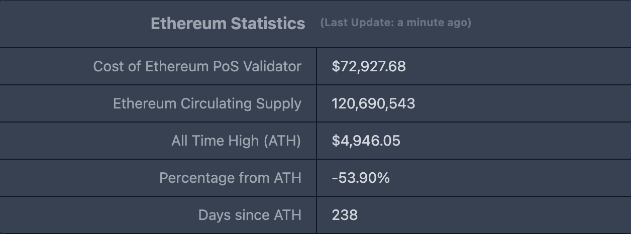 ETHUSD: Giá hiện tại $2,279.78, giá cao nhất lịch sử $4,946.05, giảm khoảng 53,89% so với mức cao nhất.