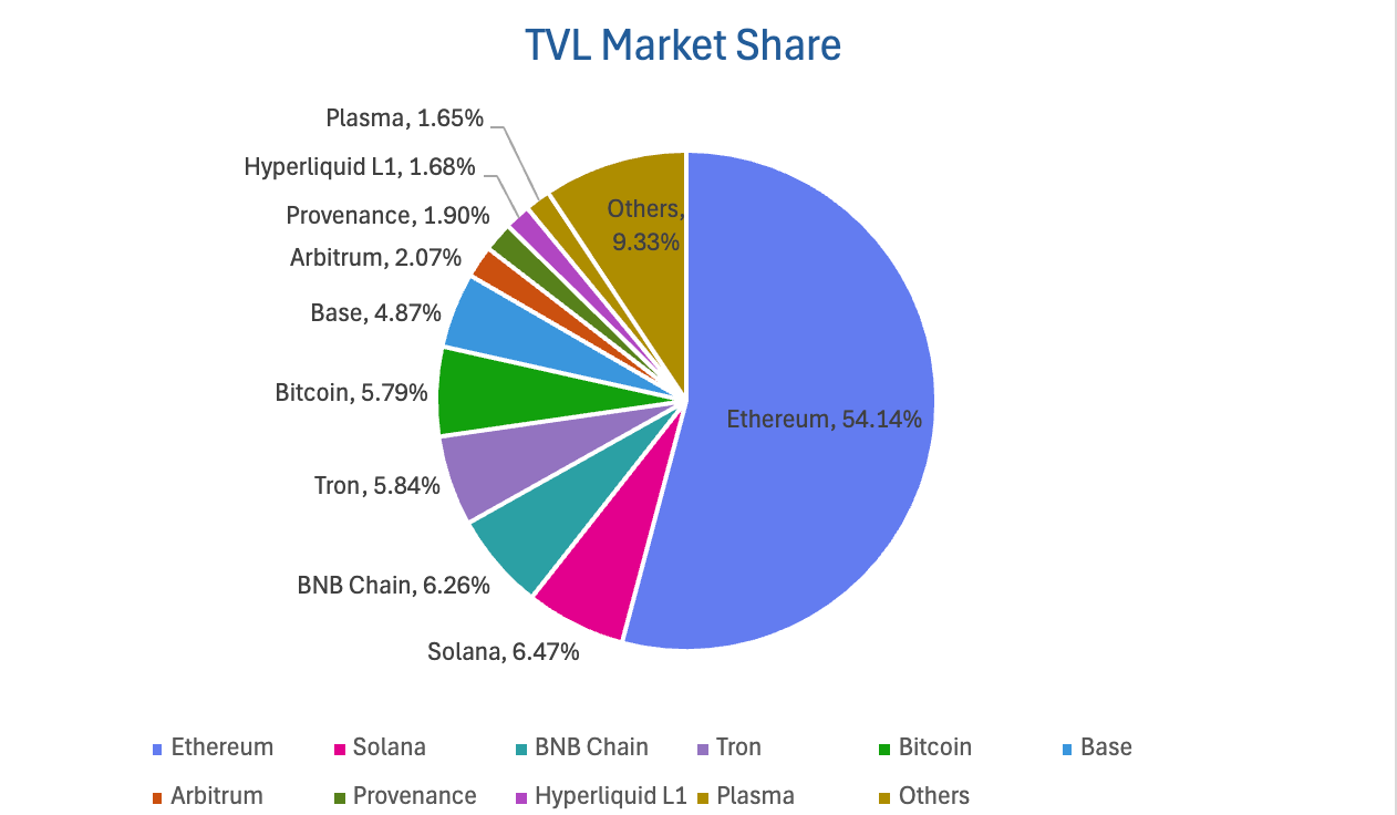 Phân chia theo public chain, ba public chain có TVL cao nhất lần lượt là Ethereum, chiếm 54,14%; Solana, chiếm 6,47%; và BNB Chain, chiếm 6,26%.
