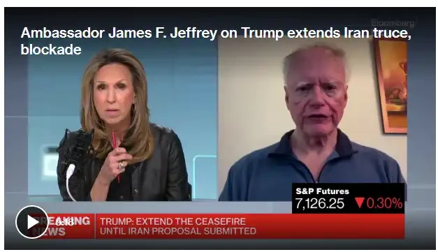 Cựu Phó Cố vấn An ninh Quốc gia Hoa Kỳ, hiện là Nghiên cứu viên xuất sắc Philip Solondz tại Viện Washington, James F. Jeffrey, tham gia chương trình Bloomberg Businessweek Daily để thảo luận về việc gia hạn ngừng bắn và trao đổi với người dẫn chương trình Carol Massar và Tim Stenovec.