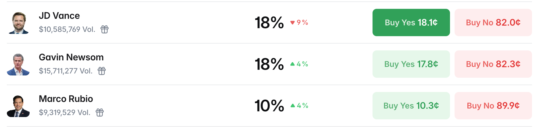 Còn những ứng cử viên có xác suất cao thực sự, như Phó Tổng thống JD Vance đang dẫn đầu về xác suất thời gian thực (khối lượng giao dịch 10,58 triệu USD), Thống đốc California Gavin Newsom (khối lượng giao dịch 15,71 triệu USD), Ngoại trưởng Marco Rubio (khối lượng giao dịch 9,32 triệu USD), khối lượng giao dịch đều thấp hơn nhiều so với các "ứng cử viên nổi tiếng" nói trên.