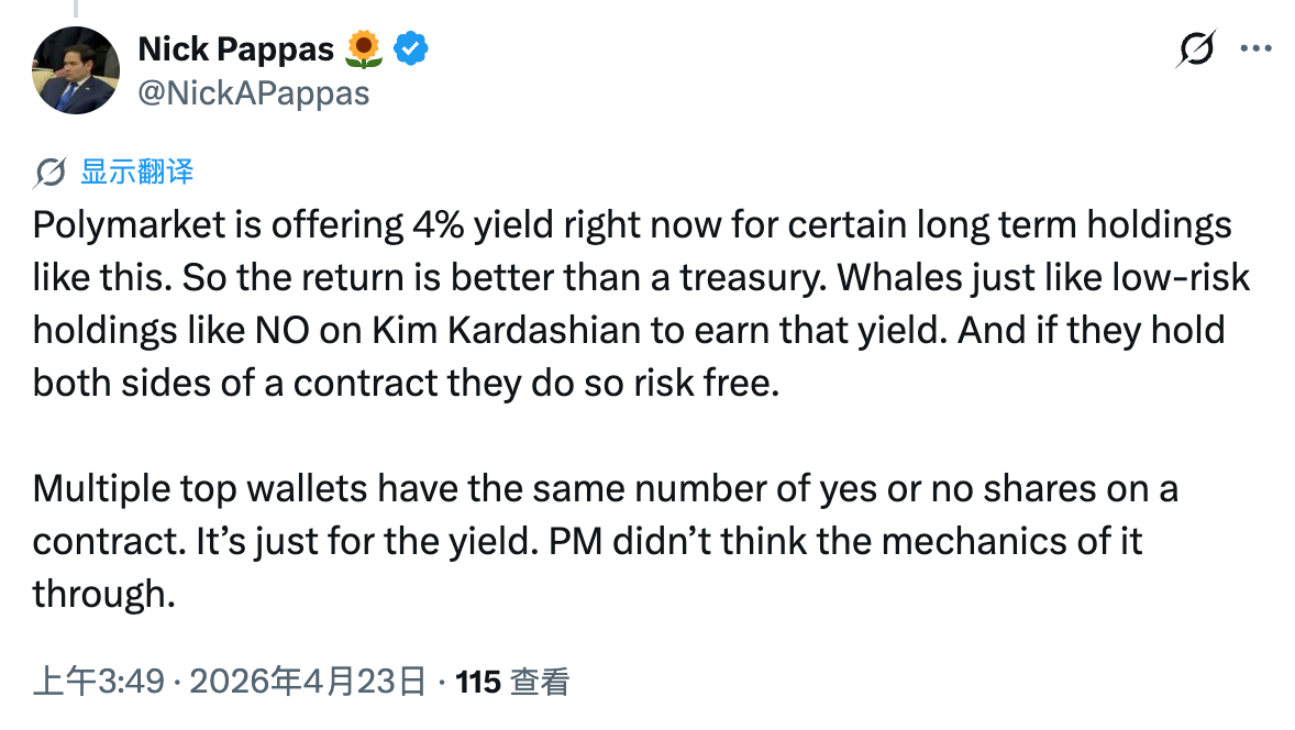 Nick Devor cho biết, tỷ suất lợi nhuận hàng năm 4% đã cao hơn lợi suất trái phiếu kho bạc Mỹ thời gian thực (kỳ hạn 5 năm là 3,98%), cá voi lớn sẽ ưa thích loại vị thế rủi ro thấp này hơn, ví dụ mua NO của James hoặc Kardashian (dù sao cũng giống nhau, ai nổi tiếng thì mua), để thu về phần lợi nhuận này; nếu đồng thời nắm giữ cả cổ phần YES và NO, thì có thể đạt được lợi nhuận phi rủi ro.
