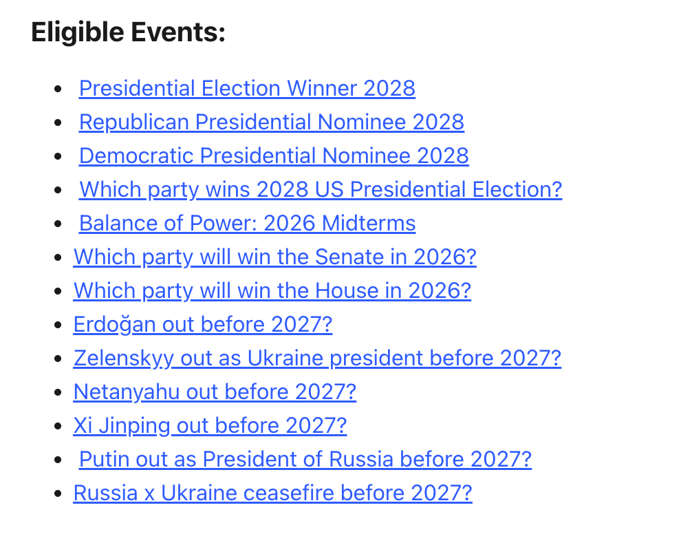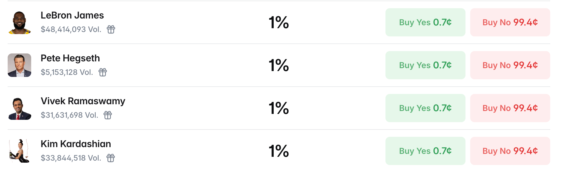 Ví dụ, người có khối lượng giao dịch cao nhất lại là ngôi sao NBA LeBron James (khối lượng giao dịch 48,41 triệu USD), tiếp theo là ngôi sao giải trí Kim Kardashian (khối lượng giao dịch 33,84 triệu USD), thậm chí phía sau còn có những ứng cử viên không có quốc tịch Mỹ (không đủ điều kiện tranh cử), như người giàu nhất thế giới Elon Musk (khối lượng giao dịch 23,14 triệu USD), Thị trưởng New York Zohran Mamdani (khối lượng giao dịch 18,39 triệu USD)...