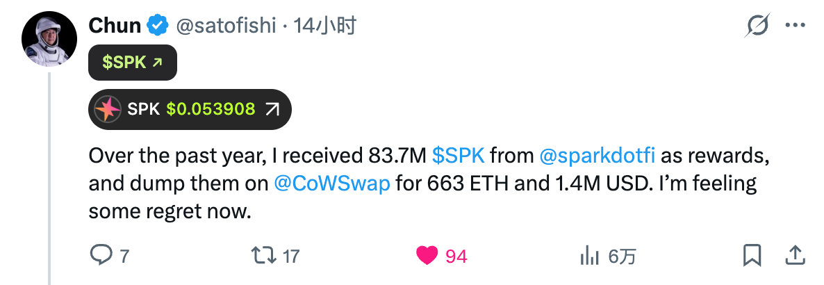 Even fish pond founder Wang Chun lamented on X: "In the past year, I received 83.7 million SPK rewards from Spark and sold them on CoWSwap for 663 ETH and $1.4 million. Now I kind of regret it."