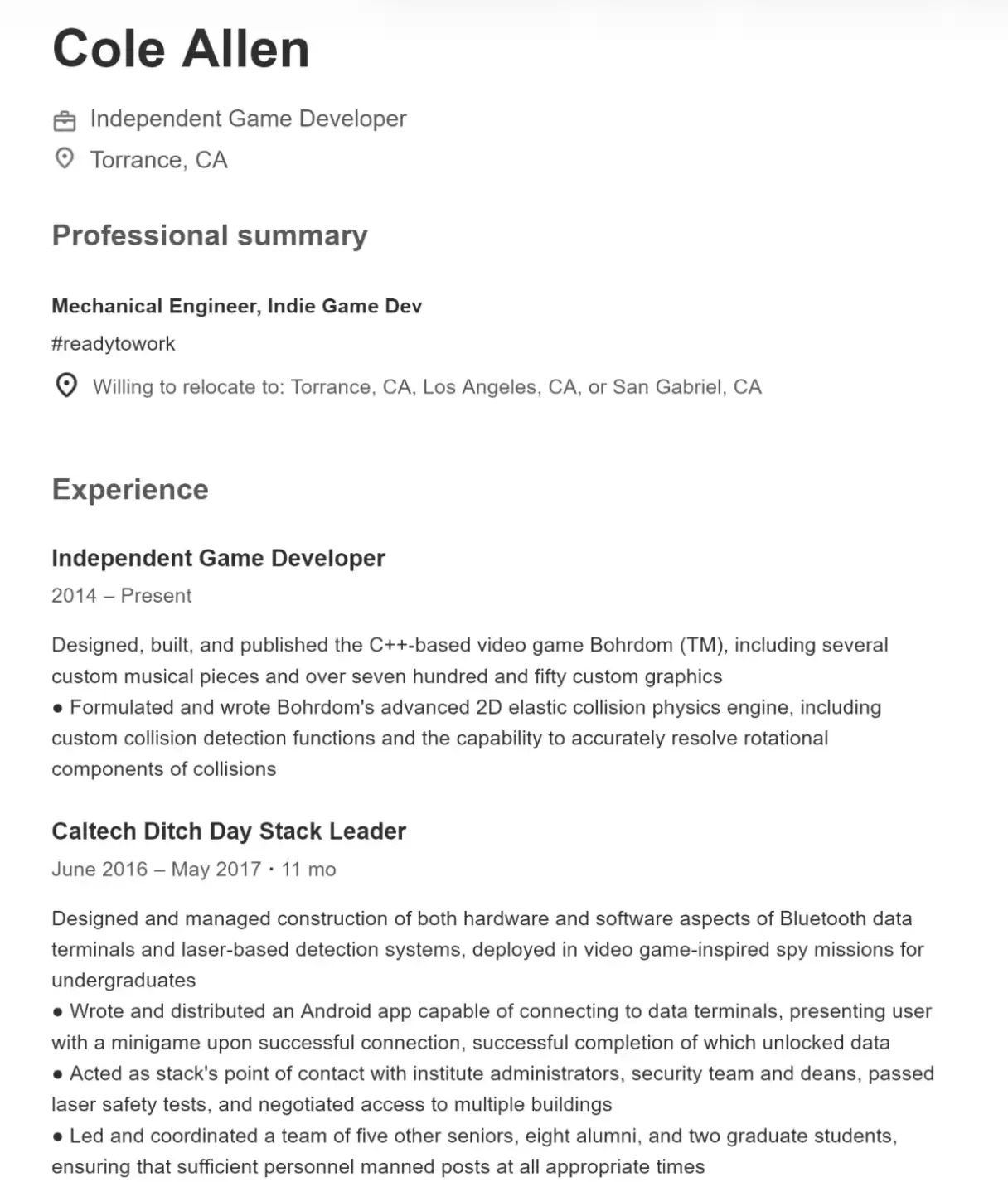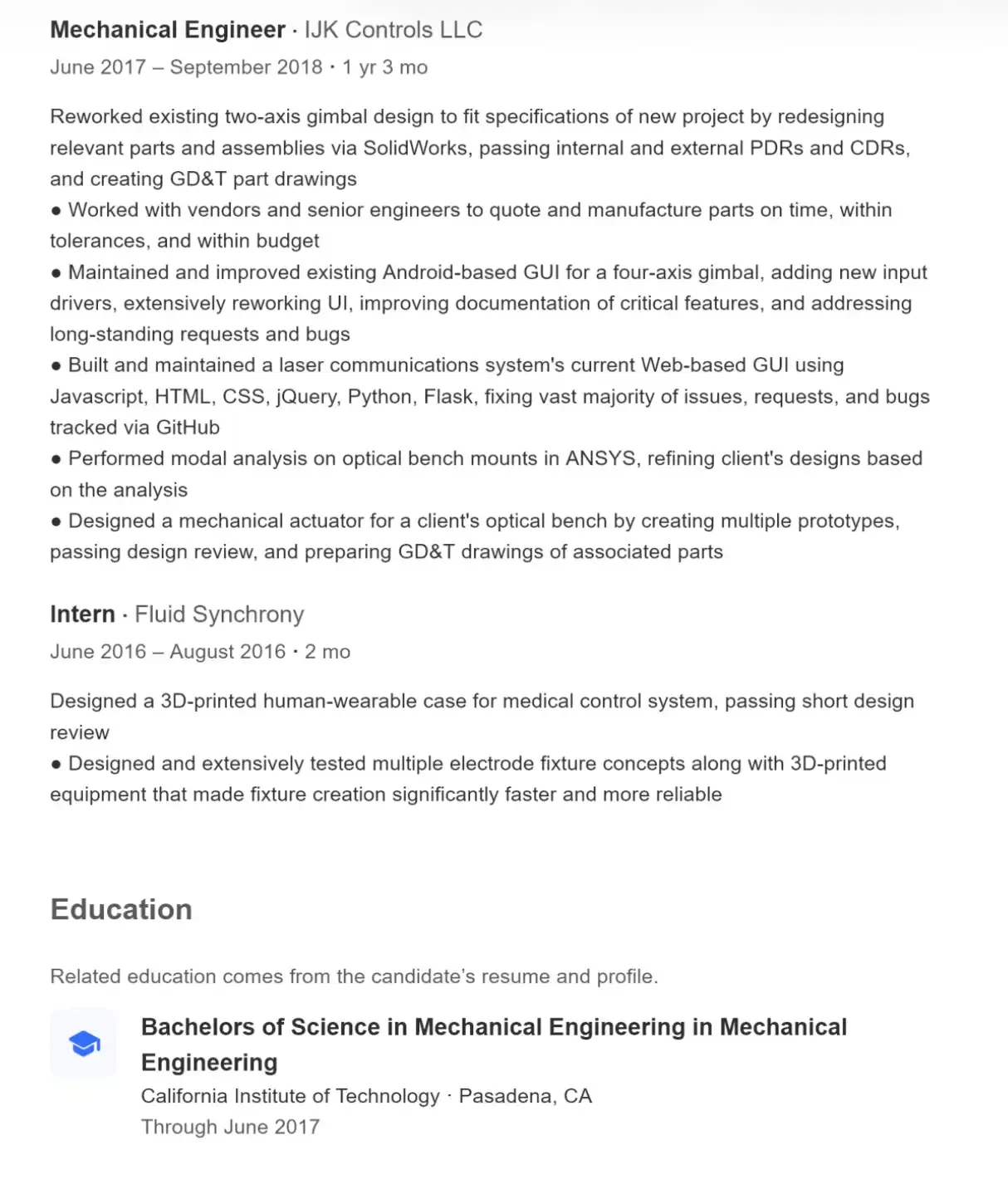 Professionally, he worked as a mechanical engineer at the Southern California engineering firm IJK Controls, primarily designing precision mechanical systems (like gimbal structures) and analyzing optical platforms, while also participating in software development, including Android UI optimization and web development for a laser communication system. Additionally, he independently developed games for a long time, completing everything from the underlying physics engine to graphics and soundtracks. Overall, his background spans engineering and software, with comprehensive technical skills.