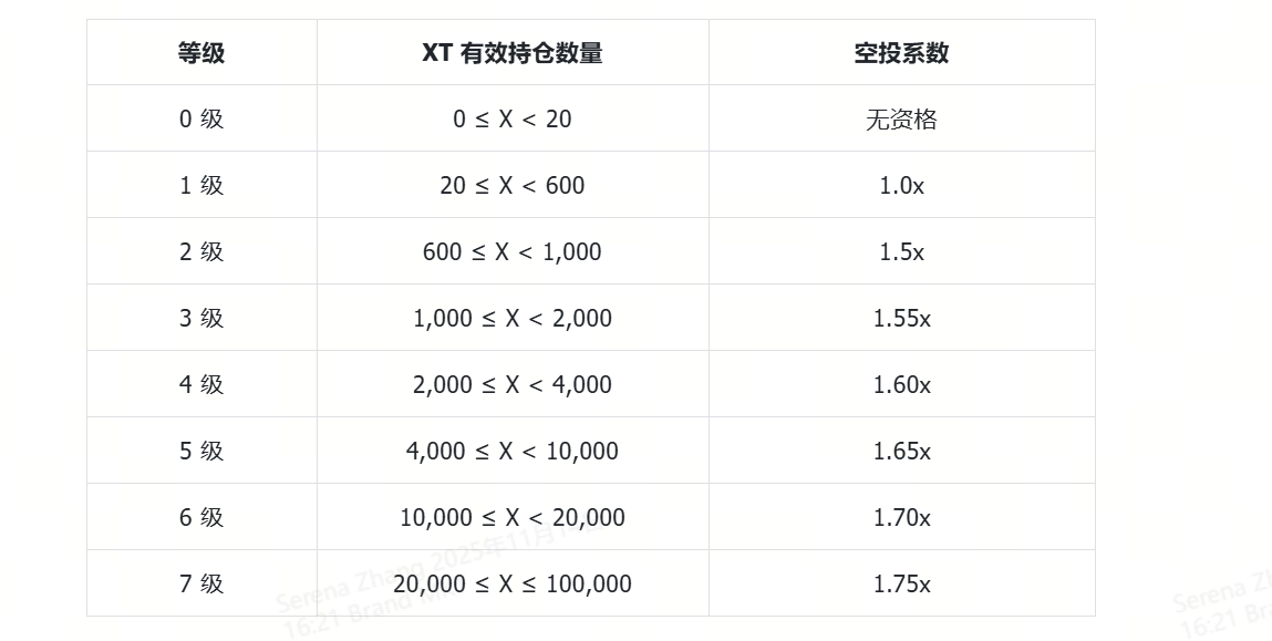 XT Airdrop 设有 1~7 级不同等级,对应不同空投系数。持仓越多,等级越高,对应的空投系数就越高,最终可获得的空投奖励就越多。