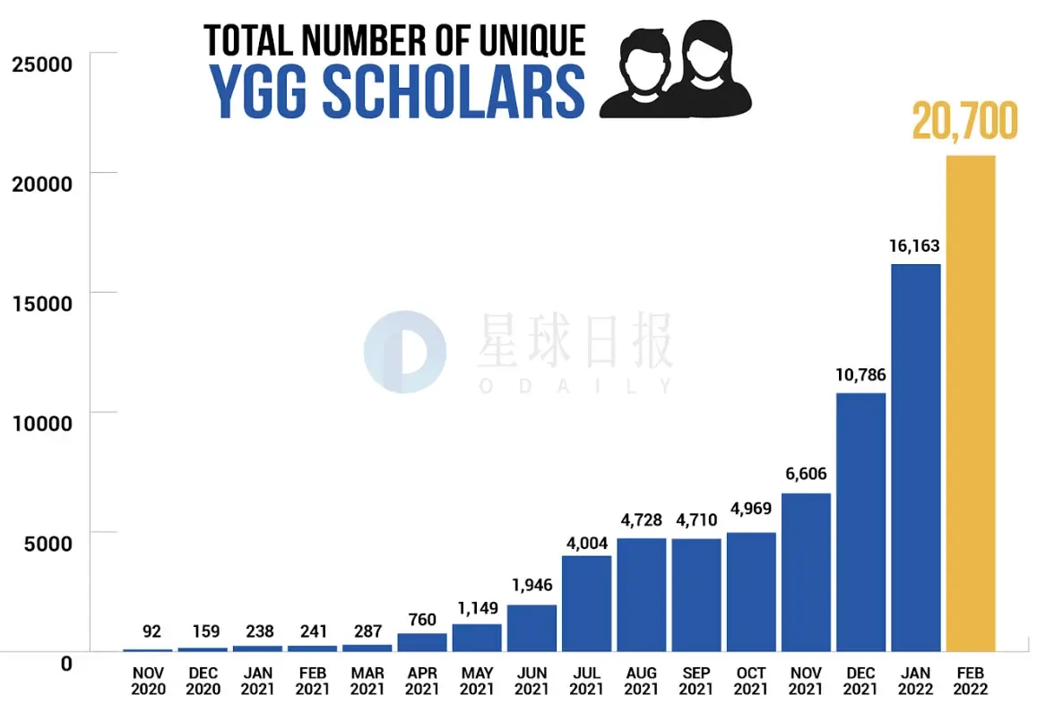 游戏公会Yield Guild Games(YGG)在Axie Infinity和其他区块链游戏中的打金成员总量突破20000名。YGG表示,在区块链游戏Axie Infinity中,其学者数量已经达到20700名,相比于2021年2月增长8500%,这些打金成员总计收获超过1840万枚SLP(Axie Infinity原生代币),约合36万美元。