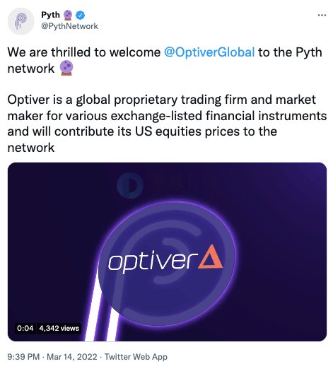 星球日报讯 预言机解决方案Pyth Network发推称,Optiver将加入Pyth Network,向其网络发布AAPL、AMZN和SPY等美国股票和ETF的价格数据。