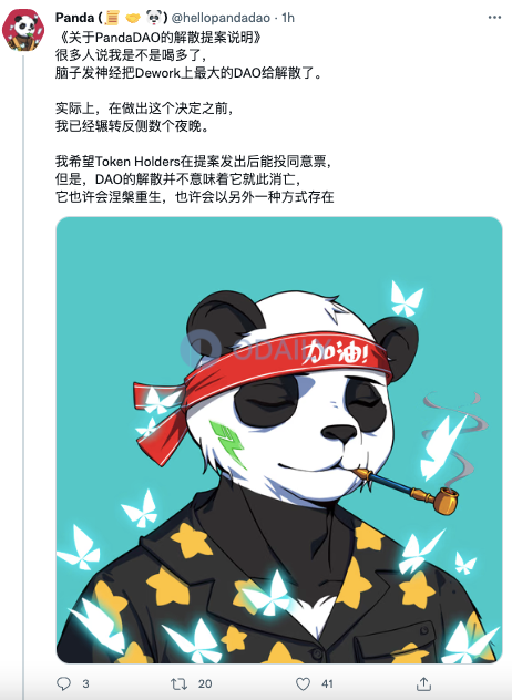 Odaily星球日报讯 PandaDAO核心成员Panda在推特上发布《关于PandaDAO的解散提案说明》。目前提案草案已经发出。预计今晚内部审计和翻译后,将会发布在Snapshot。