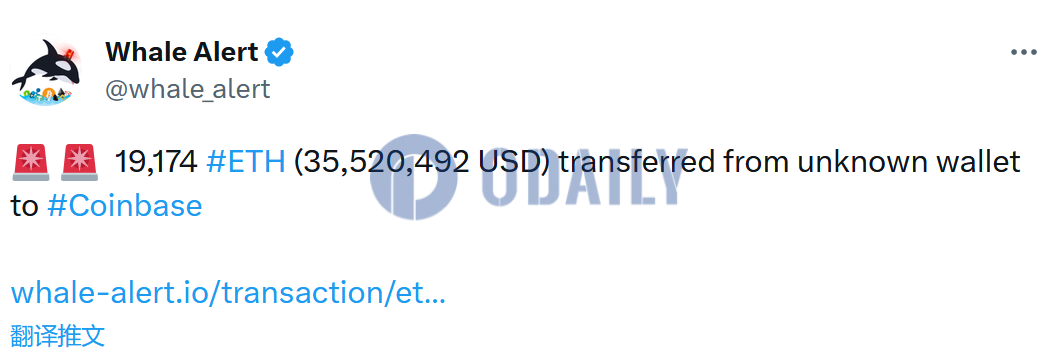 Odaily星球日报讯 据Whale Alert监测,19174枚ETH从未知钱包转入Coinbase,价值3552万美元。