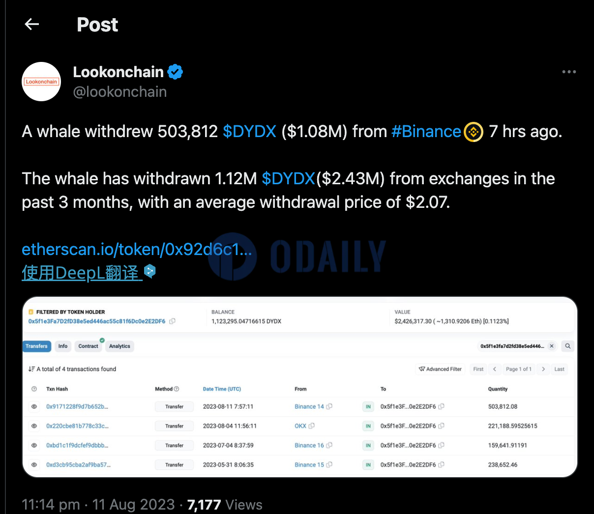 该巨鲸近3个月从各交易所共计提出112万枚DYDX,均价2.07美元。
