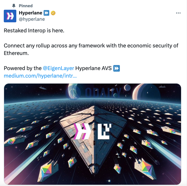 Odaily星球日报讯 据官方消息,跨链应用构建平台 Hyperlanee 宣布 Hyperlane AVS 已在主网上线,并推出由其驱动的 Restaked Interop,可将任何框架中的任意 Rollup 与以太坊的经济安全性连接起来。