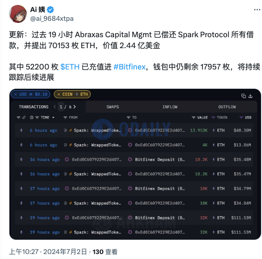 Abraxas Capital Mgmt已偿还Spark Protocol所有借款并提出70153枚ETH