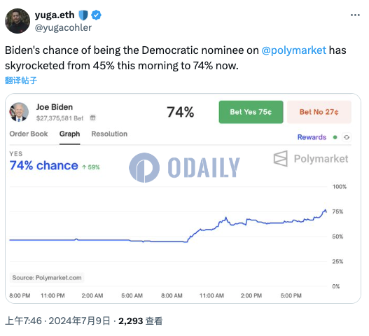 Polymarket上预测拜登成为民主党候选人的概率升至74%