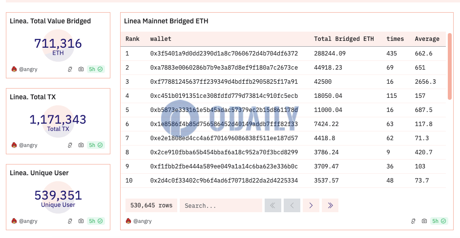 Odaily星球日报讯 Dune 数据显示,Linea 主网已桥接转入 711,316 枚 ETH,交易笔数达 1,171,343 笔,交互地址数达 539,351 个。