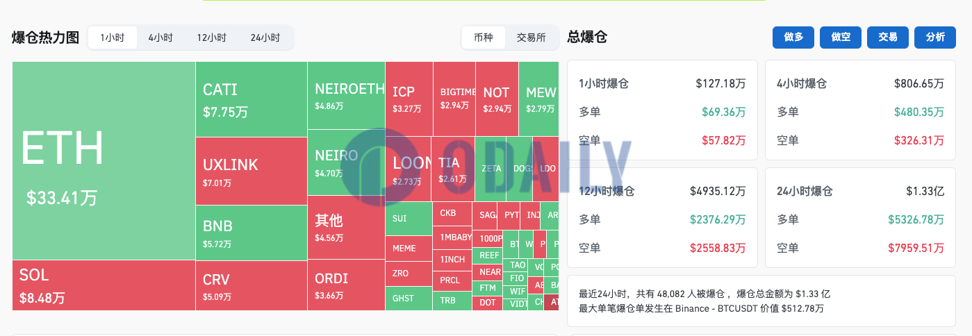 过去24小时全网爆仓1.33亿美元主爆空单,BTC市占率降至53.8%
