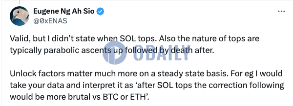 在稳定状态下,解锁因素更为重要。例如,我会把你的数据解释为‘在 SOL 见顶之后,接下来的修正将比 BTC 或 ETH 更残酷’。”