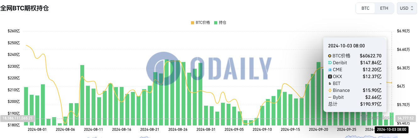 全网BTC期权未平仓头寸为190.97亿美元,ETH期权未平仓头寸为47.33亿美元