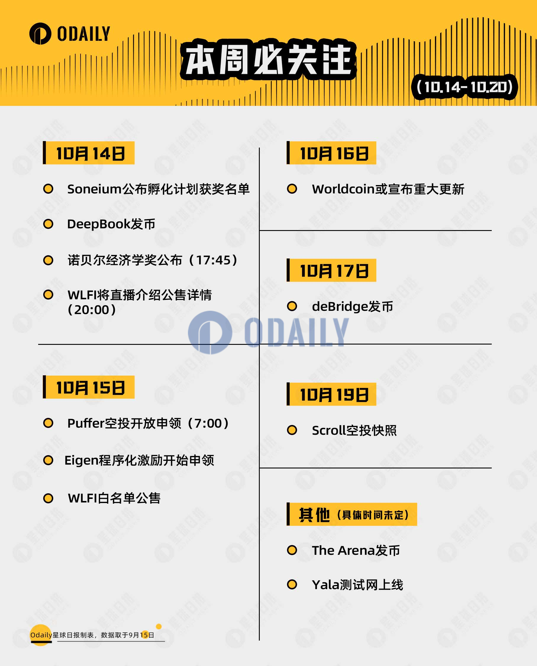 10 月 14 日:Soneium 公布孵化计划获奖名单;DeepBook 发币;诺贝尔经济学奖公布(17:45);WLFI 将直播介绍公售详情(20:00);