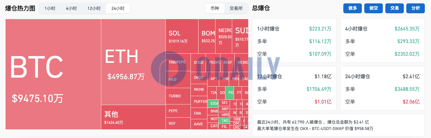 过去24小时全网爆仓2.41亿美元主爆空单,加密货币总市值重回2.4万亿美元上方