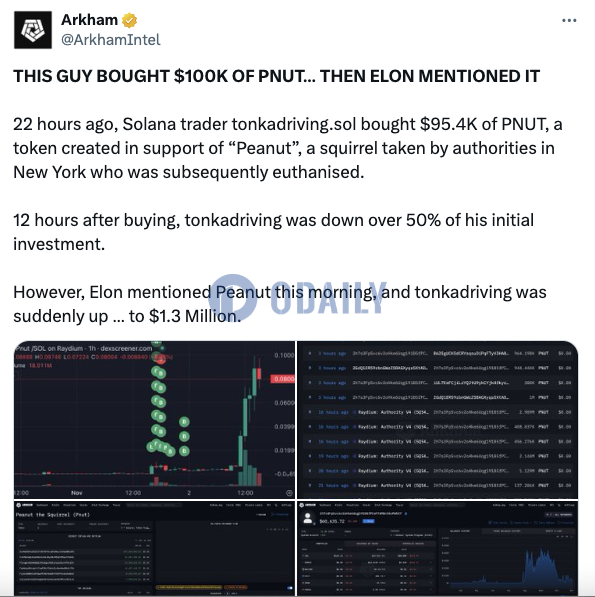 受Musk提及Peanut影响,某交易员买入PNUT 12小时后获利超12倍