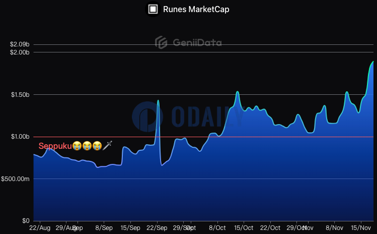 Odaily星球日报讯 据 GeniiData 数据,符文总市值突破 18.9 亿美元,24H 涨幅 16.86%。
