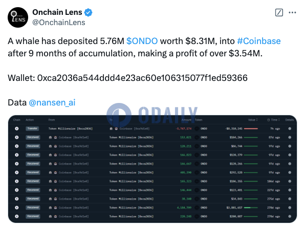 某鲸鱼已向Coinbase存入831万美元ONDO,获利超354万美元