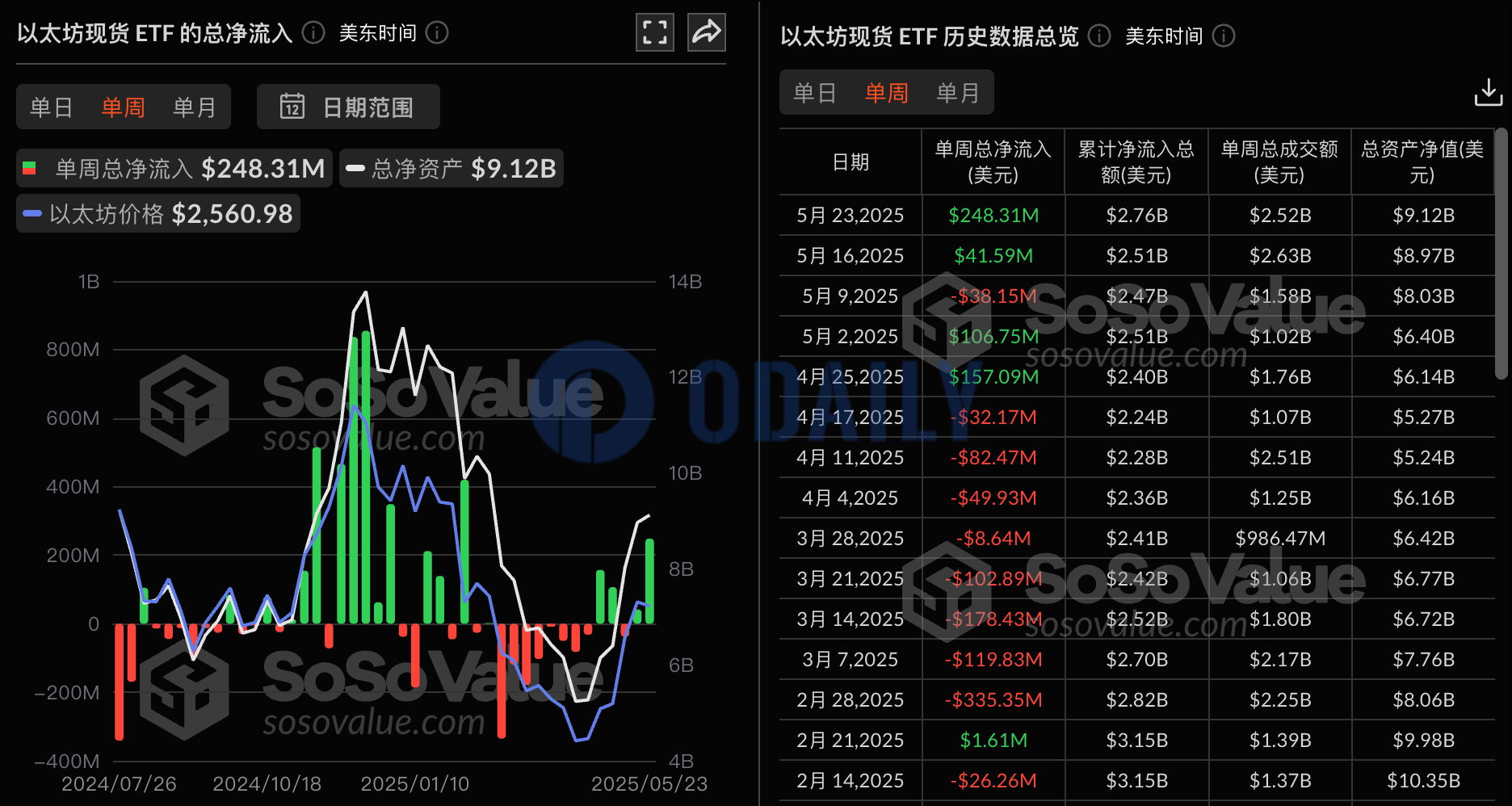 Odaily星球日报讯 根据 SoSoValue 数据,上周交易日(美东时间 5 月 19 日至 5 月 23 日)以太坊现货 ETF 上周单周净流入 2.48 亿美元,九只 ETF 无一净流出。