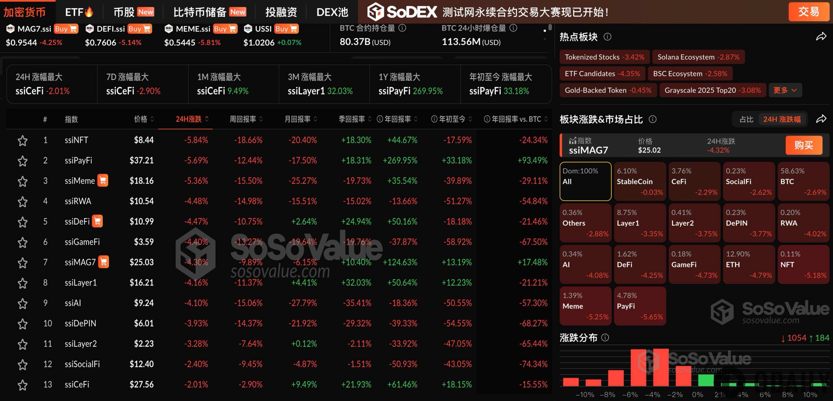 反映板块历史行情的加密板块指数显示,ssiNFT、ssiPayFi、ssiMeme 指数分别下跌 5.84%、5.69%、5.36%。