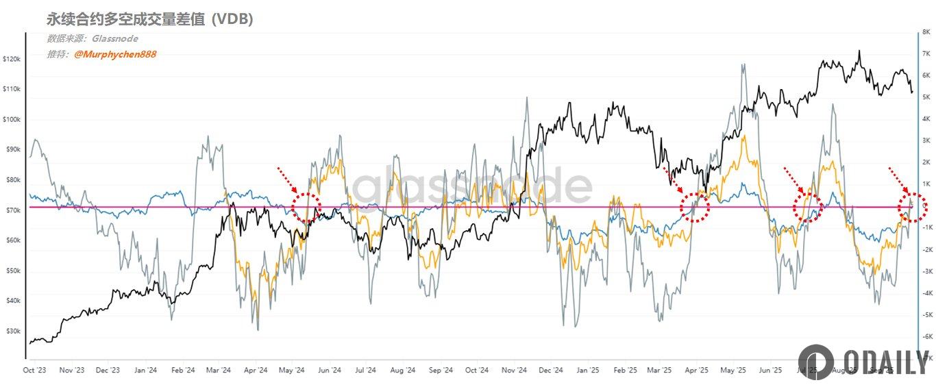 Odaily星球日报讯 链上数据分析师 Murphy 指出,永续合约多空成交量差值(VDB)已在 Binance、Bybit 等交易所回到 90 日中位数,显示多空力量重新回归均衡,市场暂未出现持续买盘或卖盘倾斜。这通常意味着行情进入过渡期,若 VDB 维持中性以上并进一步转正,或将推动短期反弹。但同时他提醒,目前关键参考水平为 STH-RP(约 11.15 万美元),若价格未能突破且 VDB 再度转负,可能引发新一轮卖压。
