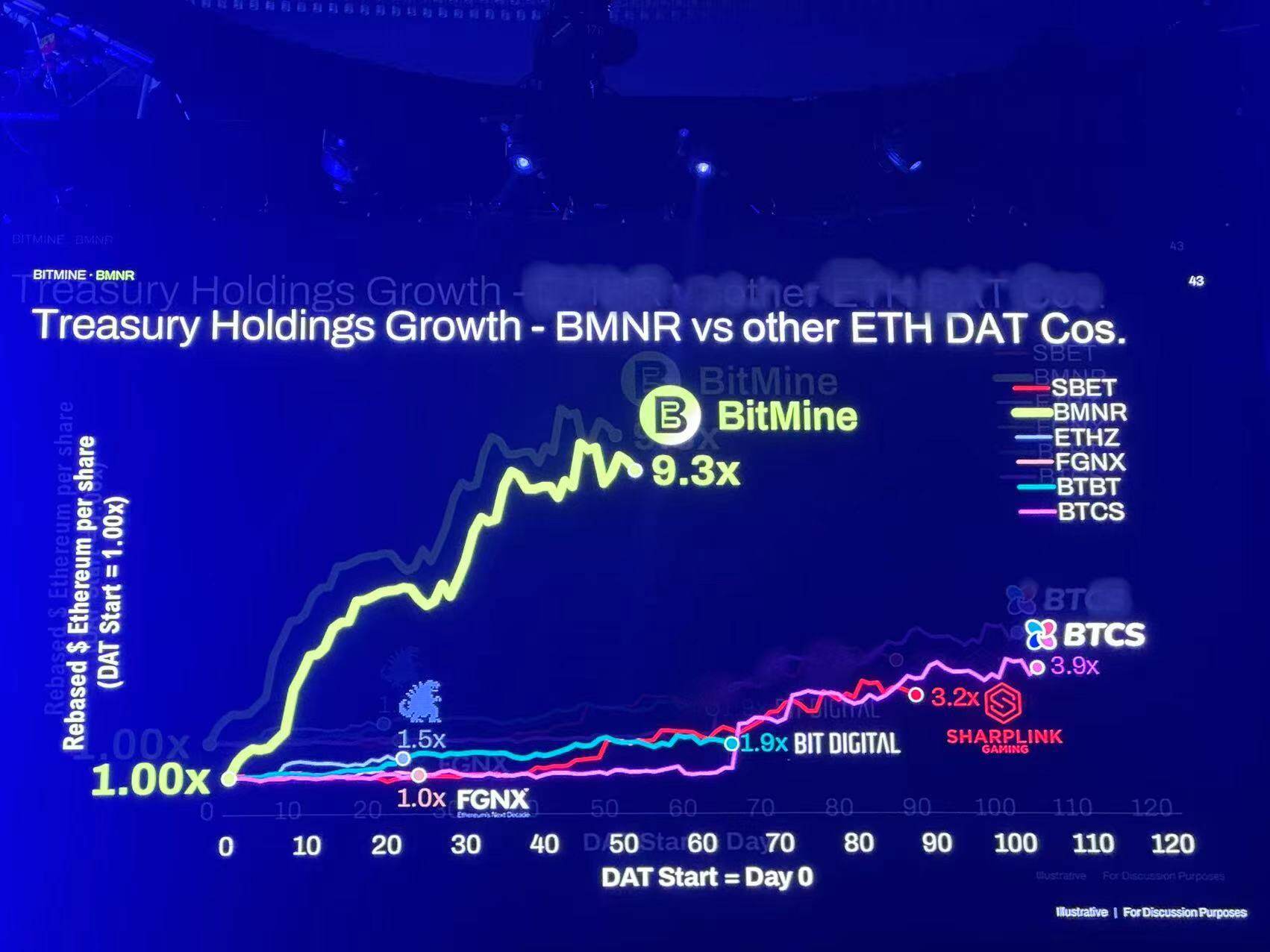 Odaily星球日报讯 Fundstrat 联创兼 Bitmine 主席 Tom Lee 在 Token 2049 活动现场发表演讲表示:“从数据上来看,截止 9 月 26 日,Bitmine(BMNR)与 Strategy(MSTR)股票交易量占 DAT 财库公司股票交易量的 86%(前者为 34%,后者为 52%);相较于其他以太坊财库上市公司,Bitmine(BMNR)的基于以太坊的每股份额增速高达 9.3 倍,远超 SBET、ETHZ、BTCS 等上市公司。”