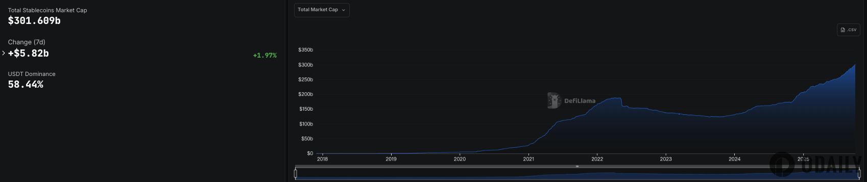 Odaily星球日报讯 据DeFiLlama数据,稳定币总市值突破3000亿美元,创下新高。