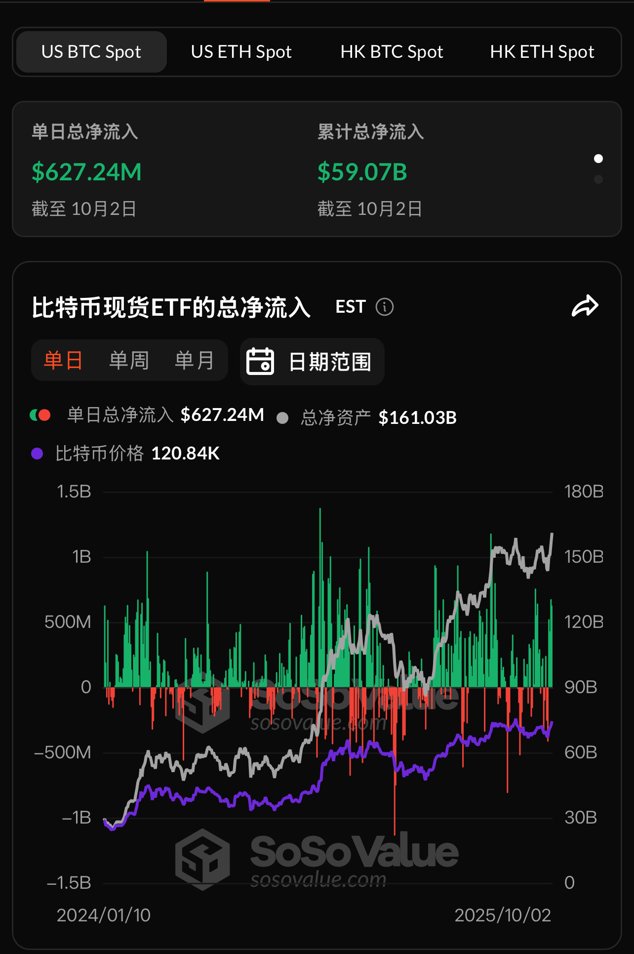 Odaily星球日报讯 根据 SoSoValue 数据,昨日(美东时间 10 月 2 日)比特币现货 ETF 总净流入 6.27 亿美元。