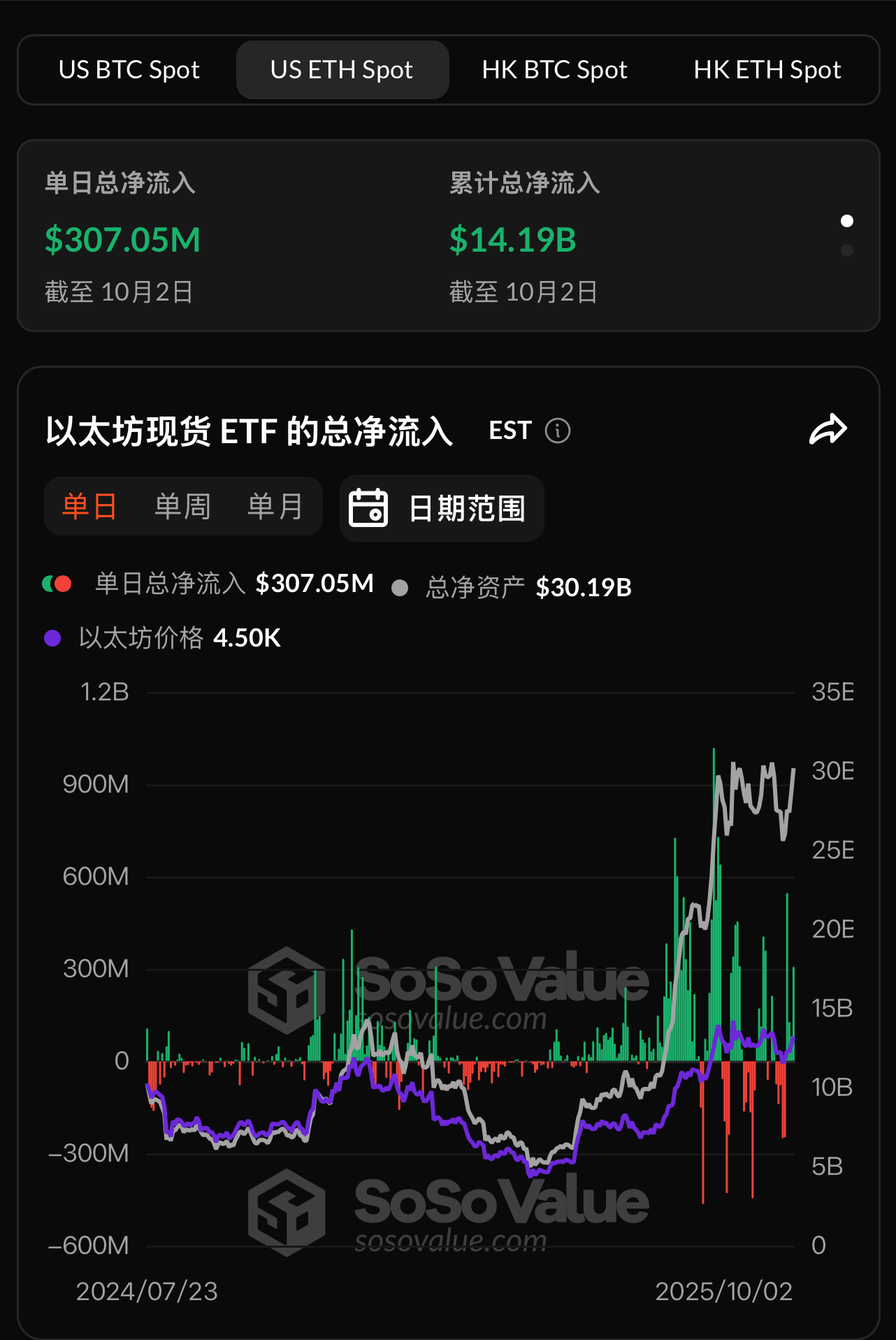 以太坊现货ETF昨日总净流入3.07亿美元,持续4日净流入