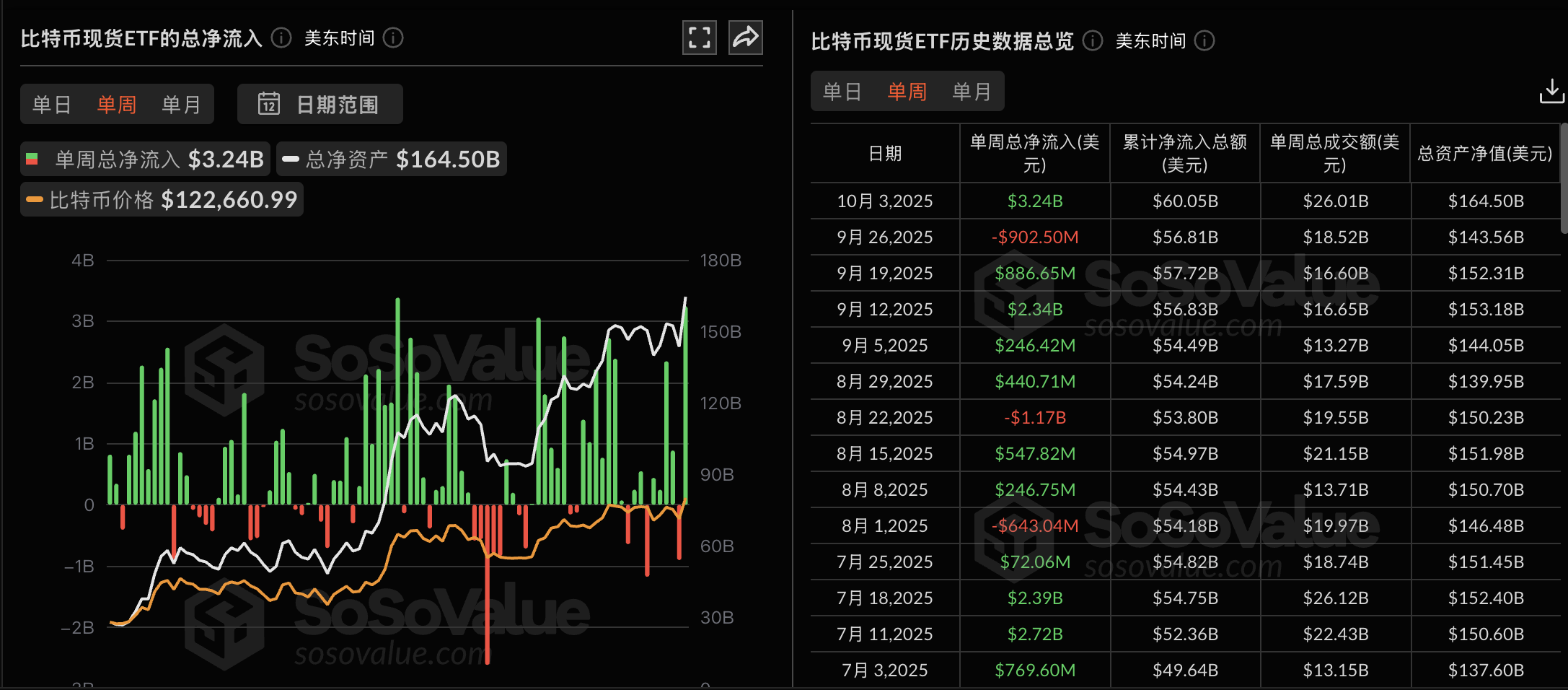 Odaily星球日报讯 根据 SoSoValue 数据,上周交易日(美东时间 9 月 29 日至 10 月 3 日)比特币现货 ETF 单周净流入 32.4 亿美元。