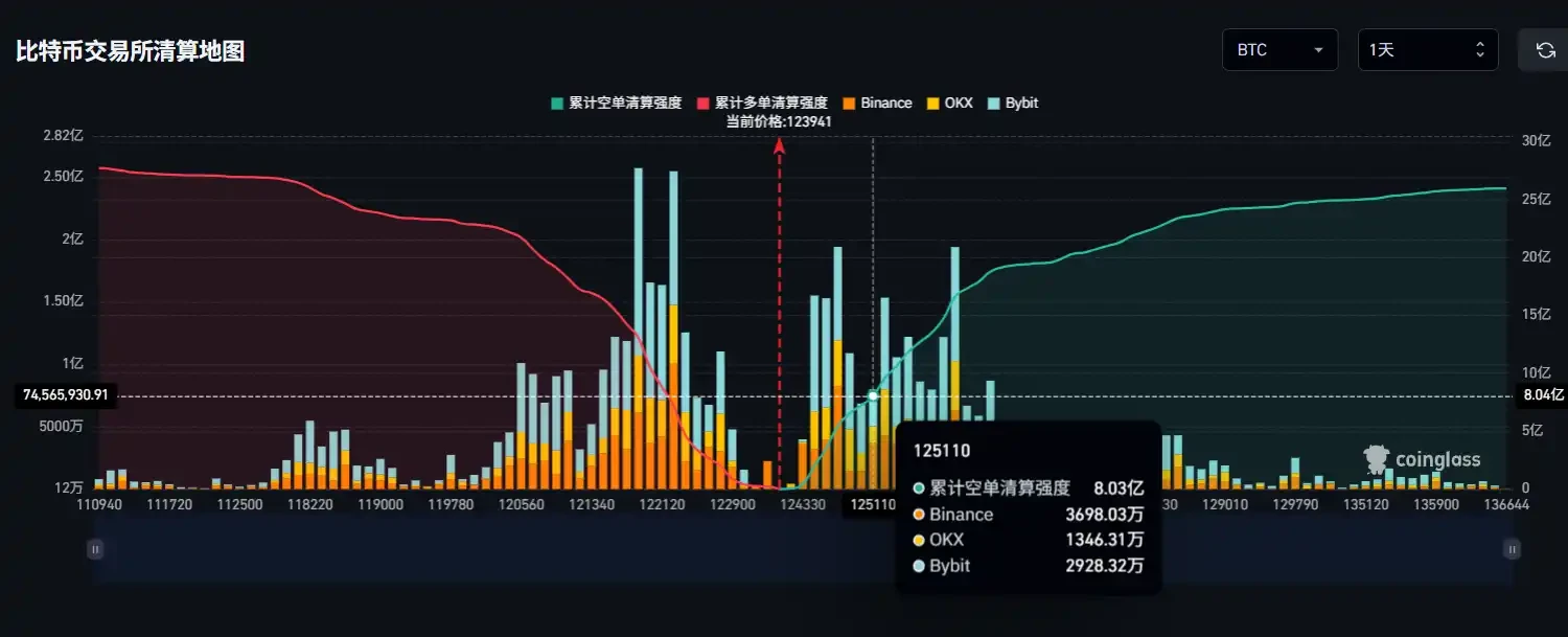 Odaily星球日报讯 据 Coinglass 数据,若比特币突破 12.5 万美元,主流 CEX 累计空单清算强度将达 8.03 亿。