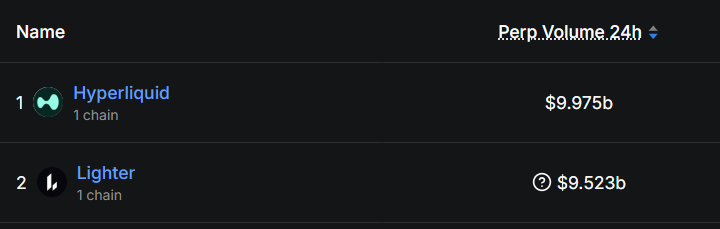 Odaily星球日报讯 DefiLlama 宣布下架 Aster 后,HyperLiquid 的 24 小时永续合约交易量触及 99.75 亿美元,超越 Lighter 升至永续合约交易量排名第一。