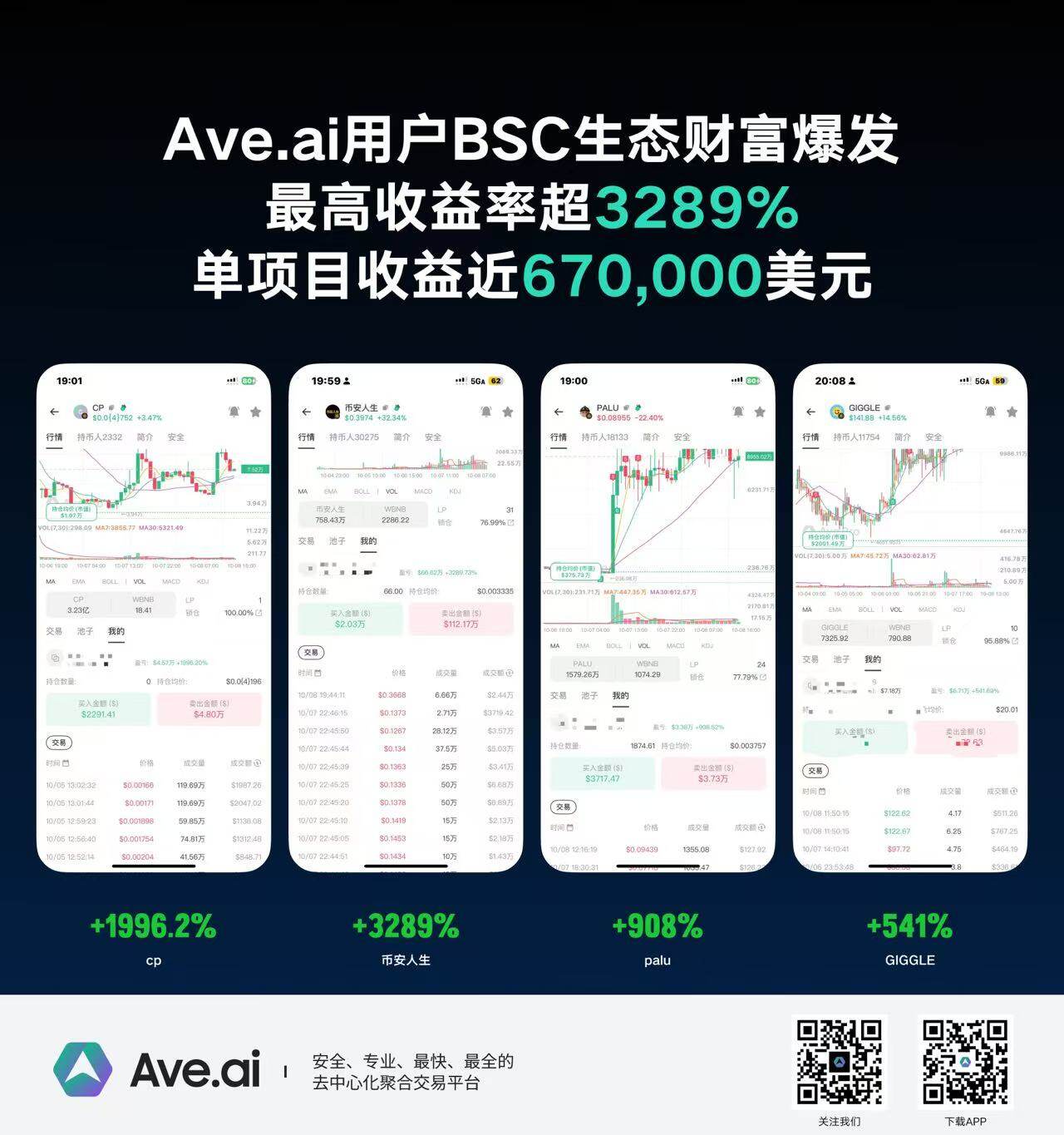 Odaily星球日报讯 近日,BSC 生态再次成为市场焦点,据 Ave.ai 平台用户数据监测,数百位交易者取得高收益,平台采集到有披露意愿的四位用户总收益已突破百万美元,再现 BSC 生态造富效应。