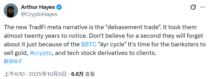 Arthur Hayes:TradFi的新流行叙事是“贬值交易”,他们不会在意加密的“四年周期”