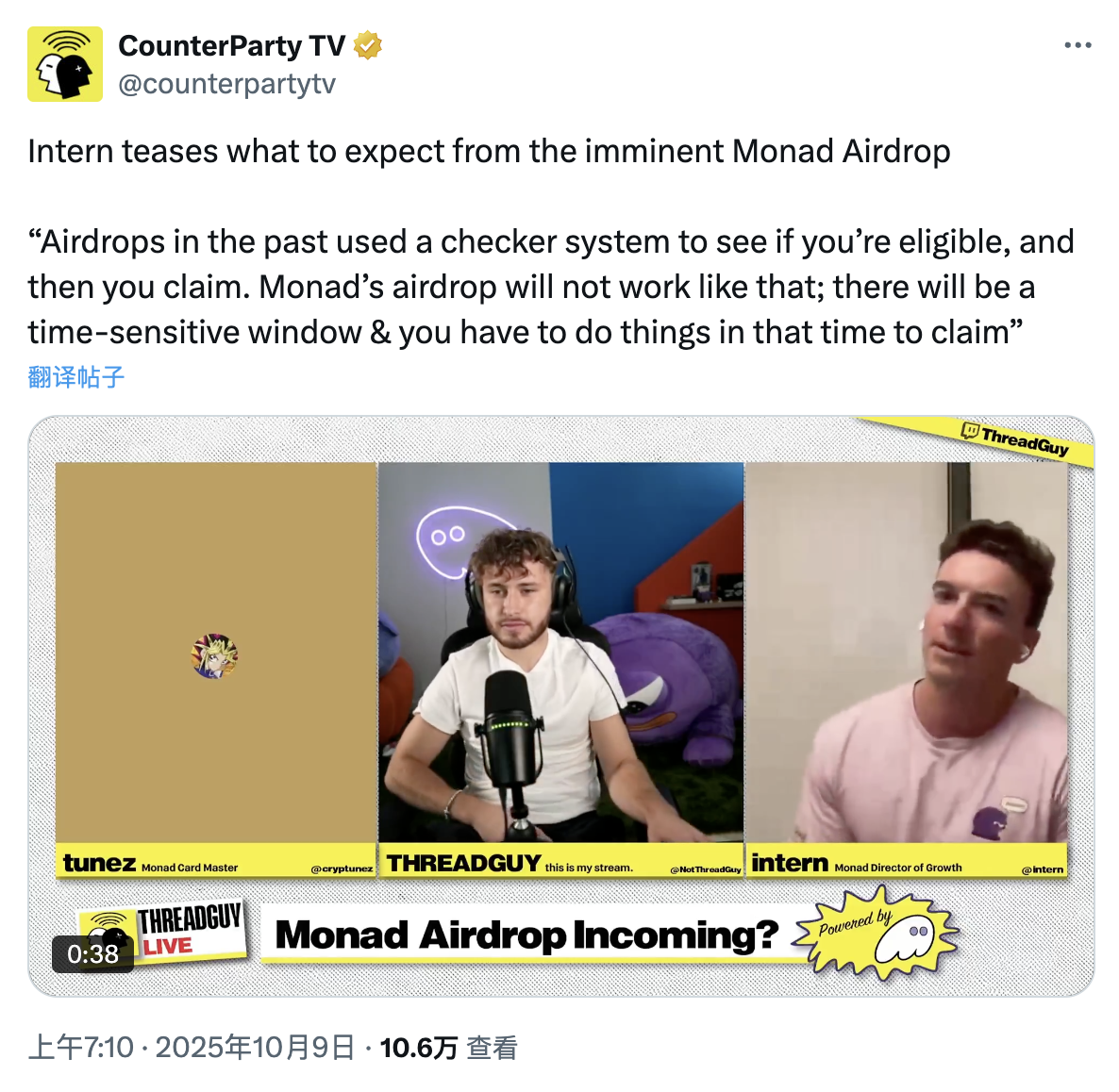 Monad增长主管:空投会设置限时窗口,用户需在时限内完成任务才可领取
