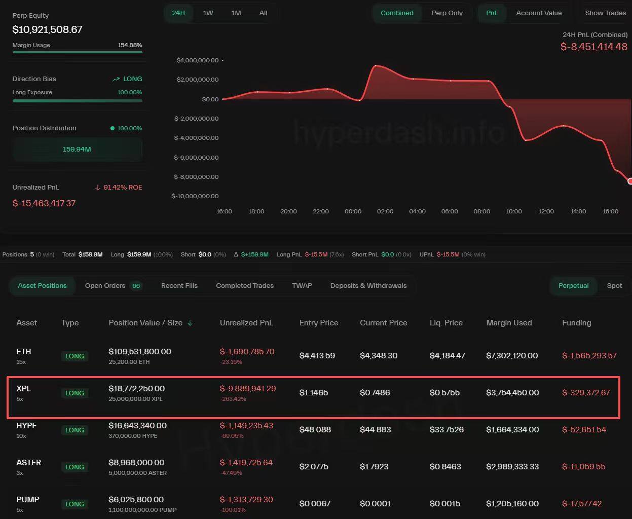 “麻吉大哥”的XPL多单浮亏近1000万美元,爆仓价0.5755美元