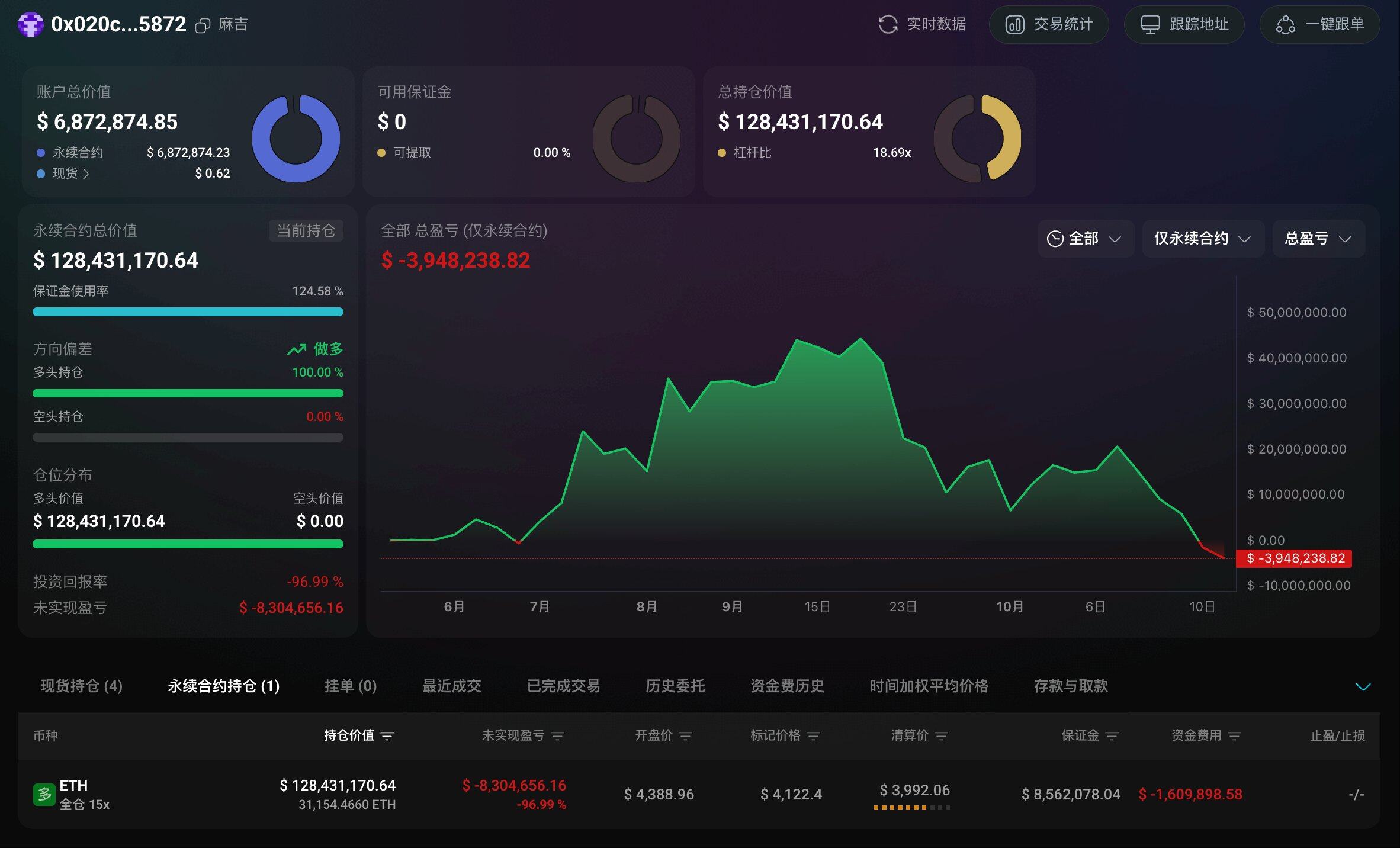 “麻吉大哥”的ETH多仓距离清算价仅100美元