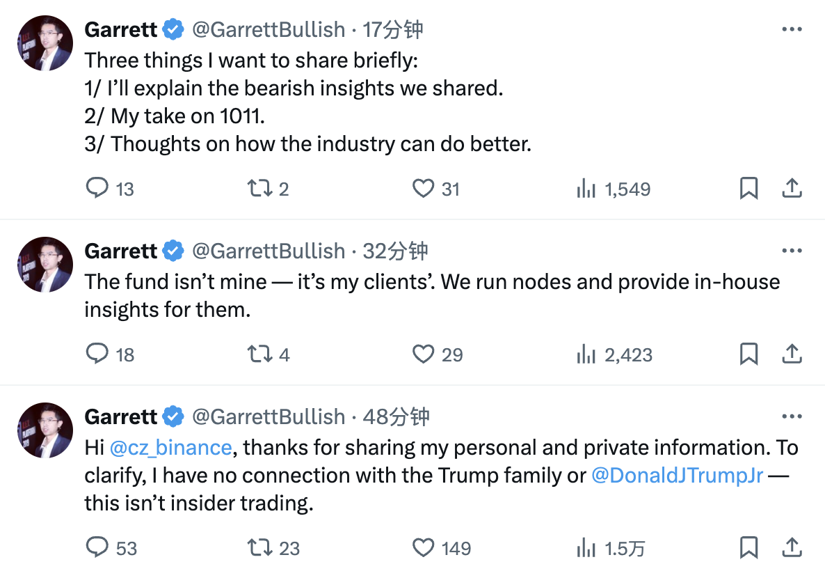 第一则动态:“嗨,CZ,感谢你分享了我的个人信息。澄清一下,我与特朗普家族或小特朗普毫无关系 —— 这并不是内幕交易。”