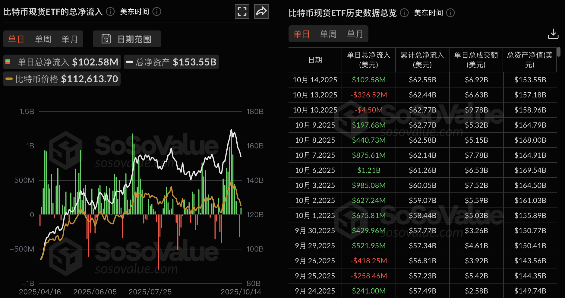 Odaily星球日报讯 根据 SoSoValue 数据,昨日(美东时间 10 月 14 日)比特币现货 ETF 总净流入 1.03 亿美元。
