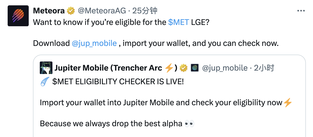 Jupiter Mobile钱包已可提前查询Meteora空投资格,支持地址导入
