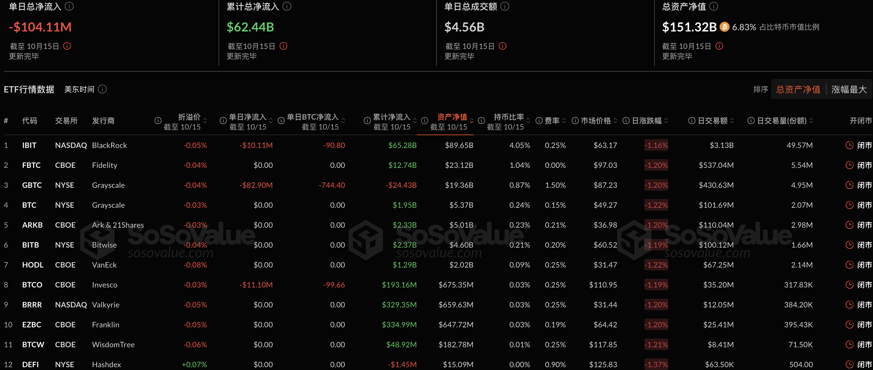 Odaily星球日报讯 根据 SoSoValue 数据,昨日(美东时间 10 月 15 日)比特币现货 ETF 总净流出 1.04 亿美元。