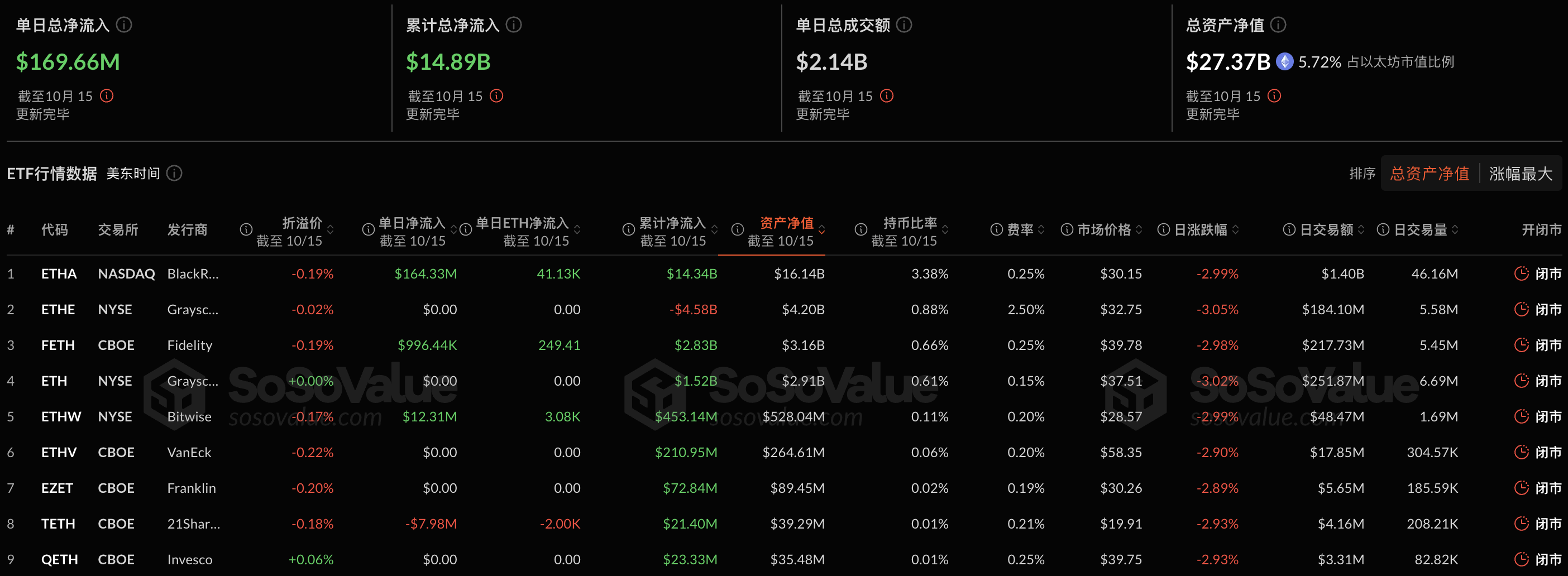 Odaily星球日报讯 根据 SoSoValue 数据,昨日(美东时间 10 月 15 日)以太坊现货 ETF 总净流入 1.70 亿美元。