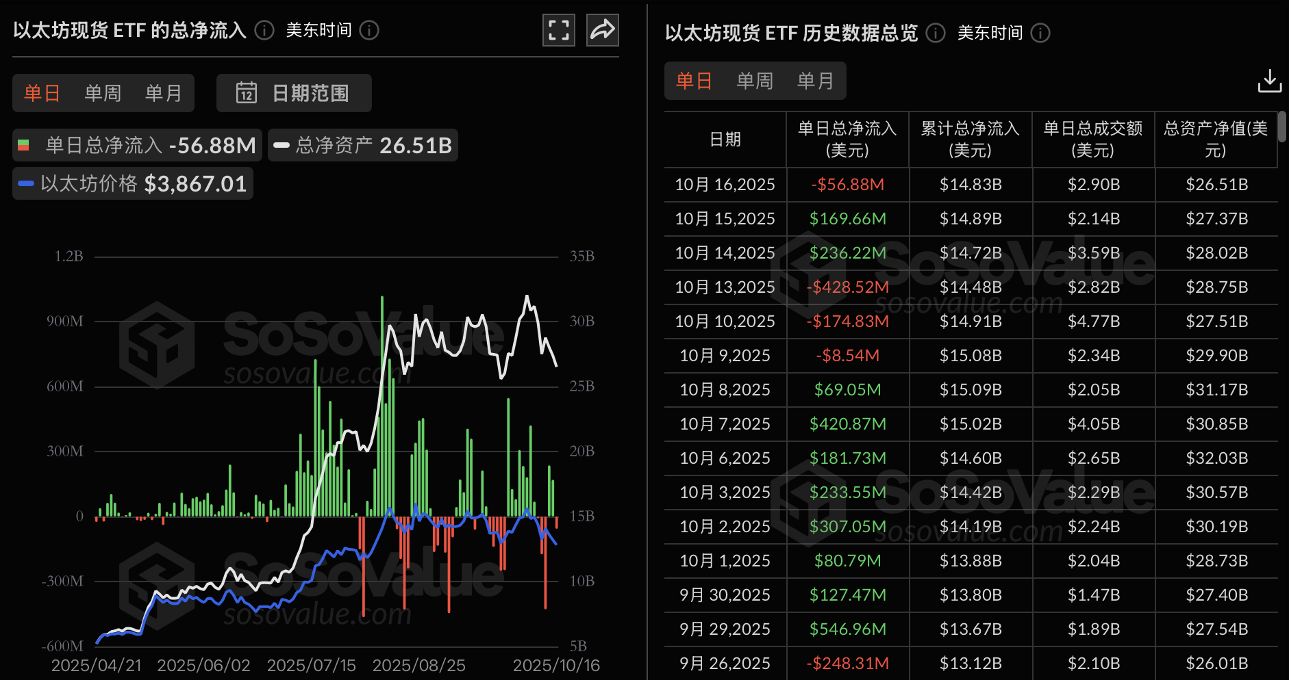 Odaily星球日报讯 根据 SoSoValue 数据,昨日(美东时间 10 月 16 日)以太坊现货 ETF 总净流出 5687.66 万美元。