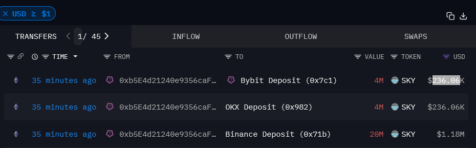 疑似Blockchain Capital地址向币安等CEX充值2800万枚SKY